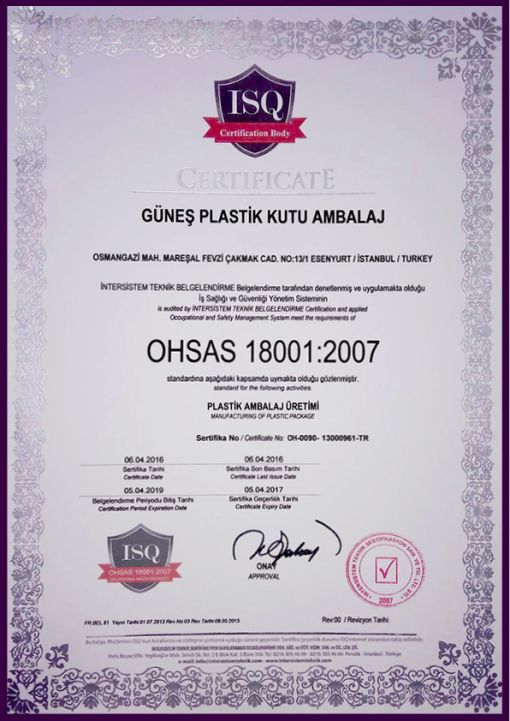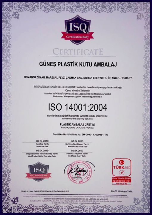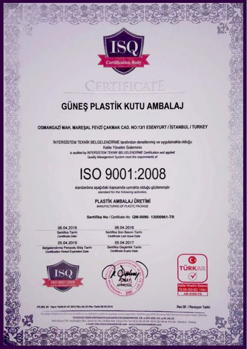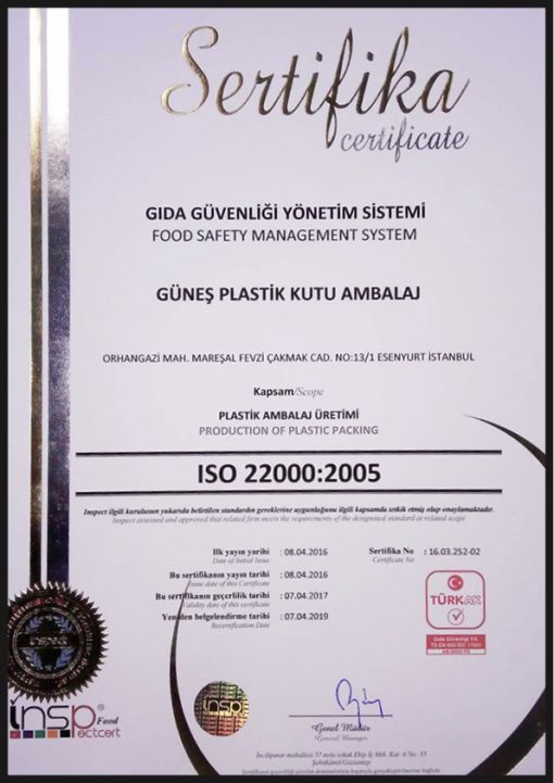 Güneş Plastik Ambalaj İçecek sektörü ambalaj ihtiyacının karşılanmasında, teknoloji ve deneyimlerimiz sayesinde müşterilerine, beklentilerinin üstünde hizmet sunmaktadır. Güneş Plastik Ambalaj, en son teknolojiyi kullanarak hazırlamış olduğu ürünleriyle, müşteri memnuniyetini, kaliteyi, doğaya saygıyı hedefleri arasına almıştır. Plastik ambalaj kapak sektöründeki en son yenilikleri sizlere sunmaktadır. İnovasyon teknikleriyle üretim proseslerinin, hizmet ve organizasyonların araştırılması, bulunması, denenmesi, geliştirilmesi, izlenmesi ve benimsenmesi yönetiminin yarattığı dinamizmle gelecekte de mükemmel ürünler ve hizmetler sunmayı hedefleyen kadrosuyla yüksek motivasyon aşılayan, her çalışanıyla daha çok büyüme ve sektör liderliği hedefine odaklanan bir yönetimdir. Güneş Plastik Ambalaj'ı plastik ambalaj üretimi yapan diğer şirketlerden ayıran en önemli özelliği, “üstün kalitede hijyenik üretim sağlaması ve müşteri memnuniyetini ön planda tutmasıdır.” Güneş Plastik Ambalaj, ISO 14001 Uluslararası Çevre Standardı (EMS: Environmental Management System) zorunluluklarını yerine getiren tutarlı bir Çevre Yönetim Sistemi (EMS) uygulamıştır. ISO 22000 "Gıda Güvenliği Yönetim Sistemini" kurup, uygulamıştır. ISO 9001:2008 Kalite Yönetim Sistemiyle imalat veya hizmet sektöründe sürekli gelişmeyi baz alarak idarenin her safhasında kalite odaklı ve müşteri memnuniyetini sağlamaktadır. |